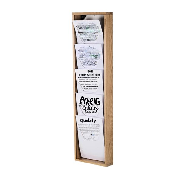 Ce présentoir mural de 5 cases est conçu pour organiser et exposer vos documents, brochures ou supports professionnels avec élégance. Fabriqué en bois naturel, il apporte une touche chaleureuse et authentique à vos bureaux, espaces d’accueil ou points de vente.